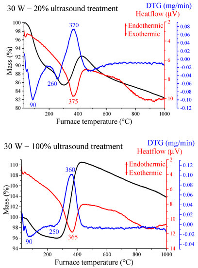 Thermal analysis curves for the sonochemically prepared Ni nanoparticles (NPs) treated at different operating parameters.