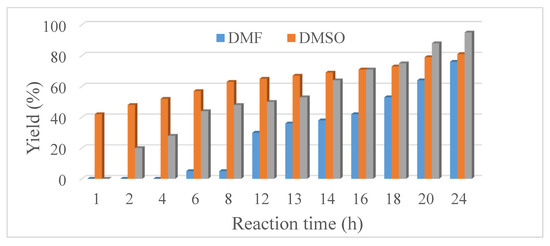 In recent decades, the impact of the Suzuki-Miyaura cross-coupling (SMC) reaction on academic and industrial research has become immense. The main advantages of these reactions are the mild reaction conditions and the high tolerance toward functional groups. Hence, the SMC reaction is often applied in the large-scale synthesis of fine chemicals and pharmaceuticals [73]. Originally, expensive palladium- [74,75] and nickel-based complexes [76,77] were used. In this work, our aim was to use the economically more accessible pure nickel metal in the synthesis of biphenyl product (Scheme 1) enhancing its activity by ultrasonic treatment. For scouting experiments the 30 W – 100% sample was used, and the investigations were started with varying the reaction time and the solvents (Figure 6). The solvents chosen were toluene, dimethyl sulfoxide (DMSO) and dimethyl formamide (DMF) with water content of 20% v/v in order to aid the dissolution of the K2CO3 base. In DMSO, the yield after 24 h was 81%. Interestingly, the biphenyl product only appeared after a 1 h induction period in toluene; however, the yield after 24 h was 95%. In DMF, the yield after 24 h was only 76%.