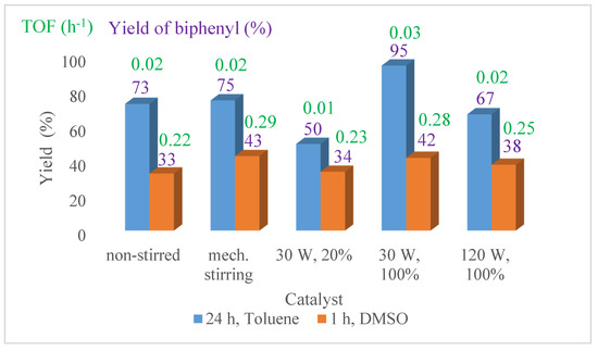 Similarly, in DMSO, the yield and the TOF values were the highest for the mechanically stirred and the 30 W – 100% ultrasonically synthesised NiNPs.