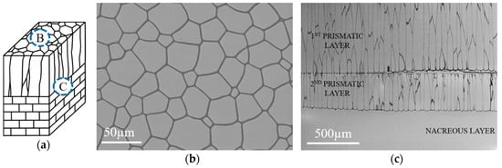 - Checa, A.G.; Rodríguez-Navarro, A.B.; Esteban-Delgado, F.J. The nature and formation of calcitic columnar prismatic shell layers in pteriomorphian bivalves. Biomaterials 2005, 26, 6404–6414. [Google Scholar] [CrossRef] [PubMed]