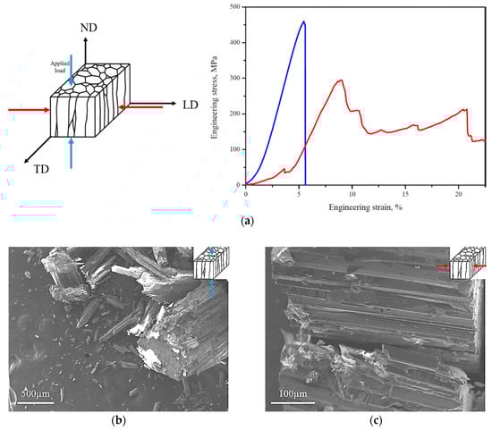 The representative stress-strain curves obtained during the uniaxial static compression testing of the outer layer of P. margaritifera shell vary significantly depending on the direction of the applied load, as shown in Figure 4a. If the compression of the sample was performed along ND, a brittle fracture, typical for ceramic materials, was observed, i.e., the samples ruptured without any plastic deformation. In this case, the material presents a high compressive strength, which was measured to be 460 ± 100 MPa. On the other side, if the load was applied along LD, the serrated stress-strain curve, typical for ceramic composite materials, was obtained. The average value of compressive strength of 220 ± 90 MPa was measured. The spread of compression strength values is a result of the biological origin of samples. In such samples, the content of the organic phase may change as well as the thickness of the layers forming of the material. However, the most important thing was that for all the samples loaded along the same direction, the curves had a similar shape revealing some tendency of the material to behave, in particular way, when the load was applied. Therefore, only the representative ones were presented in Figure 4a.