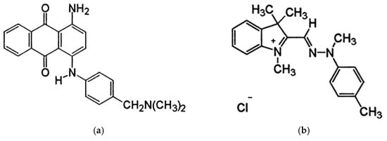 Chemical structure of (a) anthraquinone dye C.I. Basic Blue 47 and (b) azo dye C.I. Basic Yellow 29.