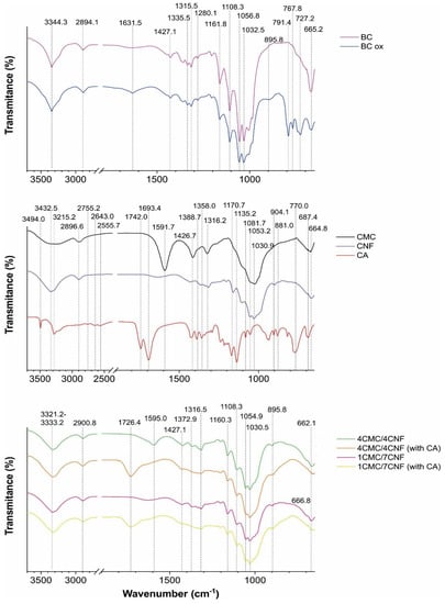 ATR–FTIR spectral lines of components (CMC, CNF, and CA) and cellulose membranes. BCox is the designation of the BC membrane after NaIO4 treatment. The CNF/CMC membranes with different mass ratios of components (4/4 and 7/1) and the addition of 5% CA are accordingly designated.