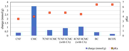 As can be seen from Figure 3, CMC (3.51 ± 0.17 mmol/g) exhibited a 10-fold higher charge than CNF (0.35 ± 0.05 mmol/g). The charge is a contribution of dissociable carboxylic groups of CMC, which differ in their pKa values by 0.5 units (pKaCNF = 3.5, pKaCMC = 4.0), meaning that the CNF carboxylic groups are slightly more acidic. When translating this to the membranes consisting of only CNF and CMC in the absence of CA (7CNF/1CMC), one can observe that their surface charge value (0.67 mmol/g) was much closer to the one of neat CNF than the one of neat CMC, most probably due to disintegration of both components when exposed to wet conditions. This is in good agreement with the theoretical values of a 7 to 1 mixture of CNF and CMC, which amounted to 0.75 mmol/g. Most of the charges in this case were a contribution of the CNF carboxylic groups. Notably, the pKa value of 7CNF/1CMC (pKa7CNF-1CMC = 4.8) was higher than the pKa of both single components, which can be consequence of the dehydration process during processing. In the case of the 4CNF/4CMC membrane without CA, the measurement was not possible due to complete disintegration.