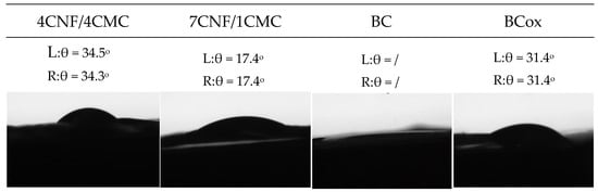 Contact angle measurement is a simple procedure for fast estimation of wettability, important in applications such as dye adsorption. The goniometry data with respective images on Figure 4 confirm the expected intrinsic hydrophilicity of all cellulose membranes, with the smallest contact angle measured in the BC membrane, where immediate drop spelling was depicted. In addition, the presence of CMC with a small substitution degree, carrying the partially hydrophobic CH2COO− moiety, increased the angle 2-fold with a 4 times higher mass of CMC, at the expense of CNF. The oxidation process also significantly increased the contact angle due to the different nature of CHO and OH groups, as well as the crystallinity and crystal orientation, as surface interactions of different crystal faces of pure cellulose differed greatly with respect to the availability of OH groups.