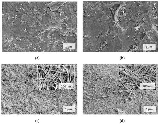 SEM micrographs of cellulose membranes, designated as (a) 4CNF/4CMC, (b) 7CNF/1CMC, (c) BC and (d) BCox, depicted in a dry state.