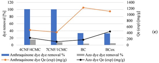 The nature of the adsorption process depends on the physical or chemical characteristics of the adsorbent system and also on the system condition []. As can be initially visualised in Figure 7, the membrane adsorption was successful to different extents on different membranes, using different cationic dyes. Regarding the latter, much more intensive dye adsorption was observed in the case of anthraquinone (blue), compared to azo (yellow) dye, which was also confirmed by the results of the dye removal percentage (Figure 7c). Here, it is worth mentioning that dye removal analysis accounted for the normalised membrane surface (20 cm2), and not the dry adsorbent weight, and results revealed similar values between CNF/CMC with different ratios and BC–BCox in the case of anthraquinone dye, with the first two combinations being threefold more effective than the second type. This we assume to be a consequence of higher water binding to BC and BCox itself, which have a very high swelling degree (~1500% and ~1200%, respectively []), which is not the case with CNF/CMC, where adsorption was more preferable due to lower initial hydration. Another important reason was the much lower surface charge of BC and BCox compared to CNF/CMC membranes, presented in the titration data. In the case of azo dyes, the most effective was 4CNF/4CMC, where the effect of the highest surface charge was pronounced. The anthraquinone dye had a 30 g/mol higher Mw than azo dye, which contributed to its substantivity towards the membrane surface. We assume that the difference in ionization constants of anthraquinone and azo dyes at the pH at which the adsorption experiment was undertaken (pH 5) is another reason for the very pronounced difference in the removal efficiency of the dyes. Azo dyes have one or more azo chromophores (N=N) and bonds between two or more aromatic rings. On the other hand, anthraquinone dyes have chromophore groups (=C=O and=C=C=), forming an anthraquinone complex. Looking at the exact molecular structure of both dyes (Figure 1), it can be assumed that azo dyes carry a positive charge, delocalized over the chromogen, while in the case of anthraquinone dyes, the non-protonated ammonium group on the one side and the quaternary ammonium group on another contribute to localized positive charge [] under the acidic condition applied in the adsorption experiment. The charge localization is expected to provide stronger ionic interaction with the negative charge on cellulosic membranes, leading to a higher adsorption effect.