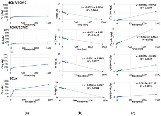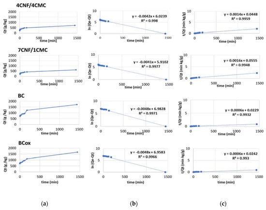 (a) Adsorption behavior of azo dye C.I. C.I. Basic Yellow 29, (b) pseudo-first-order kinetic plots, and (c) pseudo-second-order kinetic plots of 4CNF/4CMC, 7CNF/1CMC, BC, and BCox membranes.