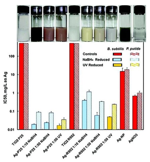 IC50 values of different hybrid Ag-TiO2 nanoparticles with and without UV light irradiations. TiO2 P25 (Degussa P25) and TiO2 R-902 (DuPont Ti-Pure R-902) were two commercial TiO2 nanoparticles. Two different molar ratios of AgNO3 and TiO2 including 1:10 and 1:50 were respectively employed to prepare Ag nanoparticles deposited onto the TiO2 nanoparticles by NaBH4 reduction and UV photoreduction to form the samples of Ag-P25 1:10 NaBH4, Ag-P25 1:50 NaBH4, Ag-P25 1:50 UV, Ag-R902 1:10 NaBH4, Ag-R902 1:50 NaBH4 and Ag-R902 1:50 UV. Ag nanoparticles and AgNO3 were purchased from QuantumSphere, Inc. Reproduced with permission from ref. [68]. Copyright © 2011, American Chemical Society.