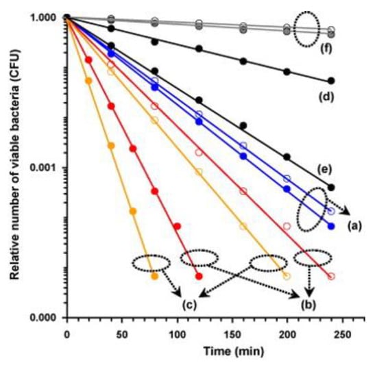 Relative number of viable E. coli on surface of (a) the anatase TiO2 (b) the α-Fe2O3 and (c) the TiO2/Fe2O3 thin films under visible light irradiation. (d) The α-Fe2O3 and (e) the TiO2/Fe2O3 thin films without light illumination. (f) Control samples containing the solution without H2O2 (○) and with H2O2 (●) with light illumination. The black circles indicated the samples of a, b, c and f containing the solution without H2O2 (○) and with H2O2 (●) with light illumination. Reproduced with permission from ref. [85]. Copyright © 2009, Elsevier.