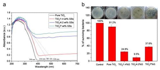 Nanocomposites of uniform TiO2 nanoparticles and graphene sheets (TiO2/GSs) have been fabricated via a facile redox reaction for antibacterial applications [88,89,90,91,92,93]. TiO2 nanoparticles were anchored on the surfaces of GSs by chemical bonds. Moreover, nanocomposites of TiO2/GSs exhibited broad absorption region from UV light to visible light. The photocatalysts of TiO2/GSs were used to kill E. coli under visible light illumination. Uniform TiO2 nanoparticles showed lower antibacterial capability in comparison with TiO2/GSs nanocomposites due to their large band gap, resulting in very low light absorption in the visible region (Figure 10). UV-Vis absorption spectra of pure TiO2 nanoparticles, TiO2/GSs with TiO2/1.4 wt%, TiO2/GSs with TiO2/4.2 wt% and TiO2/GSs with TiO2/7 wt% have shown in Figure 10a. Under visible light illumination for 12 h, viabilities of E. coli incubated with various TiO2-based nanocomposites have been respectively calculated as shown in Figure 10b. Under visible light illumination, the nanocomposites of TiO2/GSs with TiO2/4.2 wt% revealed the best antibacterial activity in comparison with TiO2/GSs with various weight ratios, including TiO2/1.4 wt% and TiO2/7 wt%. The superior antibacterial activity of TiO2/GSs nanocomposites may be explained by the increase of light absorption in visible region and effective separation of photo-generated electron-hole pairs because graphene could be applied as an electron acceptor and transporter. With the effective separation of light-generated pairs of electrons and holes, TiO2/GSs nanocomposites may produce more ROS, including ⋅OH and ⋅O2− for disinfection activity of E. coli. For the nanocomposites of TiO2/GSs with TiO2/7 wt%, the decrease of antibacterial activity may be ascribed to that the active TiO2 nanoparticles were covered by a large number of GSs, forming a shield of active sites on TiO2 nanoparticles.