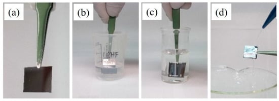 Experimental steps in the synthesis process: (a) cleaved and cleaned Si substrate; (b) immersion in 10% HF for 2 min, to dissolve the surface oxide; (c) immersion in 0.3 mM metal precursor solution for 5 min; (d) rinse sample with deionized water.