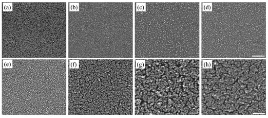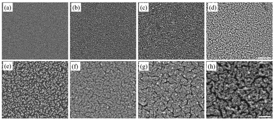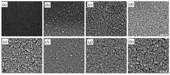 SEM images of Au nanostructures deposited on Si substrate after (a) first, (b) second, (c) third, (d) fourth, (e) fifth, (f) sixth, (g) eighth, and (h) tenth deposition cycle. The scale bar is 500 nm.