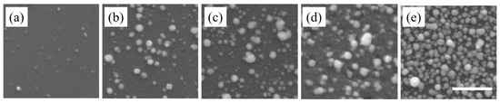SEM images of Cu-based nanostructures deposited on Si substrate after (a) first, (b) second, (c) third, (d) fourth and (e) fifth deposition cycle. The scale bar is 500 nm.