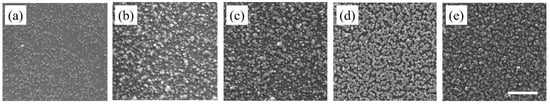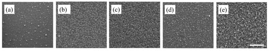 SEM images of Cu-based nanostructures deposited on Si substrate after (a) first, (b) second, (c) third, (d) fourth, (e) fifth deposition cycle with CTAB added as surfactant. The scale bar is 500 nm.