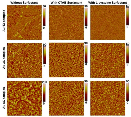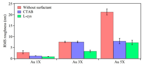 The topological information of these nanostructures was obtained through AFM studies. Figure 8 shows topographical images of Au samples after one, three, and five deposition cycles. It can be observed that increasing the number of deposition cycles resulted in Au nanostructures with increasing height and lateral size, thus, supporting the SEM data. When surfactants were added, they alleviated aggregation and agglomeration, as indicated by smoother surfaces. Figure 9 shows the root mean square (RMS) roughness values for the prepared samples. It can be observed that increasing the number of deposition cycles (from 1X to 5X) increased the surface roughness of the samples due to the increasing size of the Au nanostructures. The data confirms the visual observations from the SEM images regarding the role of surfactants in reducing aggregation and agglomeration, thereby leading to a more homogeneous surface due to L-Cysteine and CTAB.