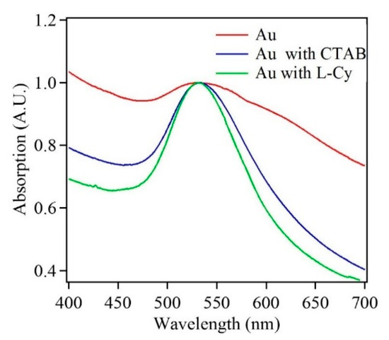 Along with the above measurements, the absorption properties of Au nanostructures were analyzed for the first deposition cycle. Figure 10 shows the UV-Vis spectra for Au nanoparticles deposited in the absence and presence of either surfactant (L-Cys or CTAB). The surface plasmon resonance (SPR) for gold appeared between 500–600 nm and was attributed to the transverse plasmon mode [44]. The UV-Vis spectra for Au nanoparticles in the absence of surfactants exhibited a broad spectrum with two maxima centered at ~532 nm and ~610 nm, which confirmed the formation of Au and presence of at least two nanostructure sizes. The UV-Vis spectra for Au samples in the presence of surfactants like L-Cys and CTAB indicated a narrower line width with a maximum at 532 nm. The comparison of UV-Vis spectra indicated that Au nanostructures deposited in the absence of surfactants were polydisperse, whereas the ones deposited in the presence of surfactants were monodisperse. The SEM images confirm the UV Vis data for the Au nanostructures (Figure 2a, Figure 4a and Figure 5a).