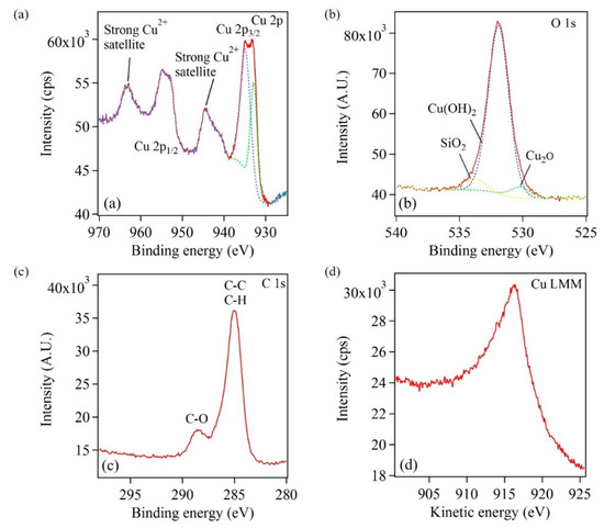 Further, the location of the O 1s peak was analyzed to study the nature of the oxide species. Figure 11b showed a broad peak that was composed of three maxima at 530.3, 531.9, and 533.8 eV, which represent characteristic oxides of Cu2O, Cu(OH)2, and SiO2, respectively [49]. Here, the XPS data was fit by three Gaussian peaks. This is represented by the dotted lined peaks in Figure 11b. Figure 11c provided information on surface adsorbed species. The strong peak at 285.1 eV matched with C–C and C–H bonds and peak at 288.6 eV was assigned to C–O bond, which arise from surface contaminants [49,50]. Thus, from the XRD (Figure S4), XPS and AES characterization of Cu-based nanostructures, it was inferred that the Cu-based nanostructures were composed of a metallic Cu core with a Cu2O and Cu(OH)2 outer layer. Similar systems of copper core and very thin copper oxide shell have been described in the literature [51,52].