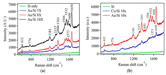 (a) Raman spectra of R6G on Si, and Au nanostructures samples after five, eight, and ten deposition cycles. (b) Raman spectra showing R6G modes for Au and Cu-based nanostructures. R6G concentration was 10−5 M.