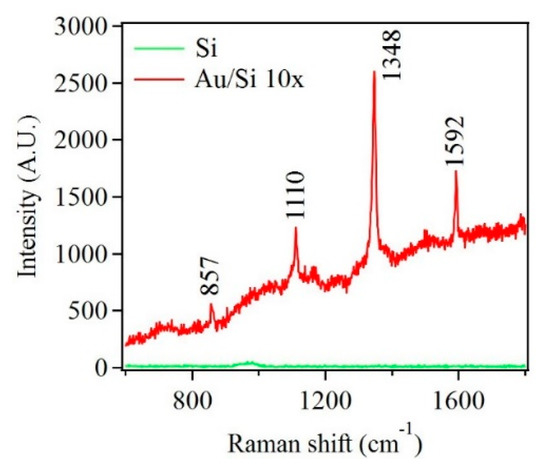 Raman spectra of paraoxon adsorbed on Si substrate and Au nanostructures deposited on Si after ten deposition cycles.