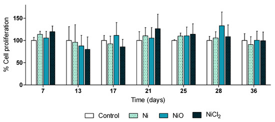 In this study, the aim was to analyze effects at relatively low doses without overt cytotoxicity. In line with this, results on cell viability showed that repeated exposure to 0.5 µg/mL Ni and NiO NPs, or the corresponding soluble Ni salt (in form of NiCl2), for 6 weeks did not affect cell viability/proliferation of BEAS-2B cells at any of the investigated timepoints (Figure 2).