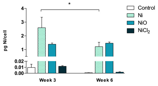Cellular nickel content was quantified by ICP-MS after 3 and 6 weeks of exposure. Results and expressed as pg Ni/cell and are presented as mean values ± S.D. (n = 3). Significant results are indicated with asterisks (* p-value < 0.05).