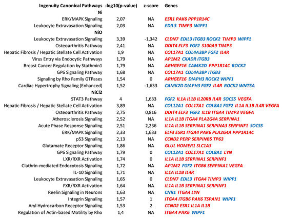 Canonical pathways enriched after six-week exposure of BEAS-2B cells to Ni, NiO nanoparticles or NiCl2. Pathway analysis was performed in IPA on the differentially expressed genes following exposure of BEAS-2B cells to Ni, NiO nanoparticles or NiCl2. Significantly enriched canonical pathways (−log10 (p-value) > 1.3) are illustrated, ordered according to the statistical significance. Pathways containing less than three differentially expressed genes were excluded. Some pathways are additionally characterized by z-score, a measure of the activation state of the pathway. NA, z-score not available; color coding indicates direction of differential expression, red—upregulation, blue—downregulation.