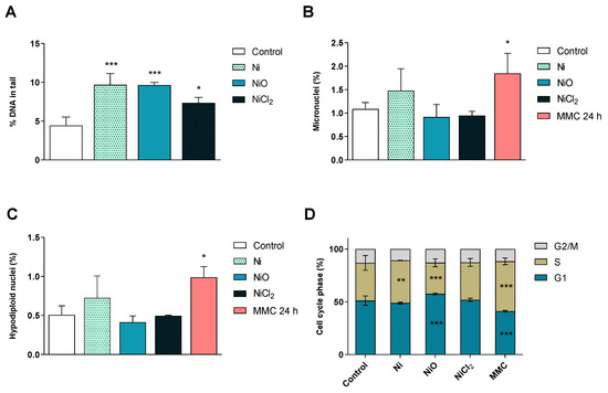 At the end of the six-week repeated Ni exposures, DNA damage was evaluated by using the comet assay and a flow-cytometry version of the micronucleus assay. The results showed that all treatments induced DNA strand breaks (Figure 6A). The DNA damage was, however, not translated into chromosomal breakage (micronuclei, Figure 6B) or loss (hypodiploid nuclei, Figure 6C). Cell cycle phases were also evaluated in the same extensive flow-cytometry assay. Ni NPs increased the number of cells in the S phase, while NiO NPs increased the number of cells in the G1 phase, as well as decreased the S-phase compared to the control (Figure 6D). However, none of the treatments induced apoptosis or necrosis (data not shown).