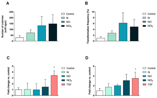 Cell transformation and motility. (A–B) Soft agar cell transformation was determined after 6 weeks of exposure. Results are expressed as total number of colonies (A) as well as the overall transformation frequency (B) in which the colony-forming efficiency was considered (mean ± S.D., n = 3). Cell migration (C) and invasion (D) was evaluated after 6 weeks of exposure and results are expressed as fold change compared to the control presented as mean ± S.D. (n = 3). Positive control: TGFβ, 15 ng/mL 72 h. Significant results are marked with asterisks (* p-value < 0.05).