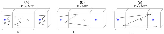 Schematic illustration of relative sizes of repeat period D and phonon mean free path (MFP) for a A/B planar superlattice: (a) , (b) , and (c) .