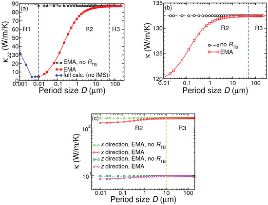 Period size dependence of cross-plane room-temperature thermal conductivity for: (a) Si(D/2)Ge(D/2) PSL; (b) NDSL (Ge insert of volume fraction in Si matrix); and (c) TMD NDSL ( of WS inserted in MoS). Sample size L is 1 mm the Si/Ge composites in (a,b), and 100 mm for the MoS/WS composite in (c). Regions R1, R2 and R3 correspond to , and , respectively, where D is repeat period and represents phonon mean free path. Results in panel (a) for the Si/Ge PSL are obtained from full-scale DFT-Boltzmann calculation in Region R1, and from the EMA method in Regions R2 and R3. Results in panels (b,c) are obtained from the EMA method.