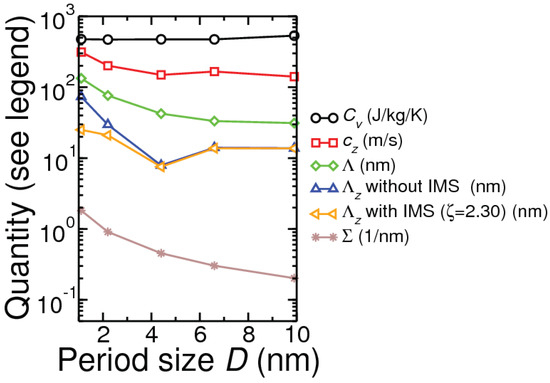 The typical cross-plane conductivity shape in Figure 4a for the repeat period range 1–12 nm (sample size 1 mm) can be explained by considering two physical properties [9,31]: cross-plane phonon group velocity and interface density . As seen in Figure 5, both and decrease as D increases up to about 4 nm. For 4 nm, while continues to decrease linearly with D, the decrease in is much reduced. Decrease in and have opposite effects: the former reduces and the latter increases the cross-plane conductivity (). The combined effects of changes in and , together with increase in specific heat , result in an increase in for nm. Consistent with this consideration is the variation of the Bose occupation weighted ’cross-plane mean free path’ , which shows a minimum at 4.4 nm in Figure 5. Notice that in contrast to the occupation weighted mean free path does not show any dip as D increases.