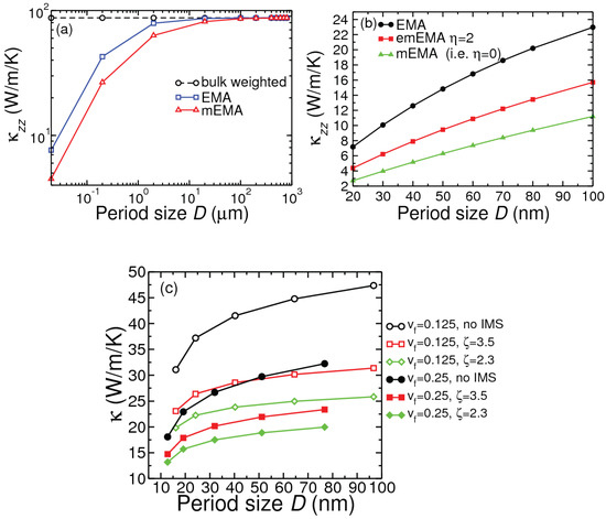 The results in Figure 6a suggest that for Si/Ge PSL of sample size 1 mm becomes almost the same as when the period size grows up to several tens of micron. Clearly, mEMA is more appropriate for composites with period size ranging between nanometers and a few microns. Figure 6b shows a comparison of the results from the emEMA method with those from the mEMA and EMA methods for a Si/Ge PSL of sample size 500 nm. Using a reasonable choice of for interface inhomogeneity, lies in between and . From the results presented in panel (c) three points can be made. Increasing the insert volume fraction of Ge in a Si matrix lowers the conductivity of the nanocomposite. For a given insert fraction, the decrease in the conductivity is more pronounced even for lower amounts of interface mass smudging. Finally, even a small amount of IMS can alter more strongly than adding a larger volume of insert. For example, it is clear that 10% of mass smudging ( for , see Methodology section) across the first atomic layers of Si and Ge lowers the conductivity more than what does doubling of the Ge insert volume fraction. Consideration of an additional 0.01% mass smudging across the second interface atomic layers ( for ) reduces the conductivity by another 0.06% (not shown in the figure).
