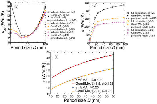 Panels (a,b): Comparison of period size dependence of room-temperature cross-plane conductivity for Si()/Ge() PSL using the EMA, mEMA and emEMA methods. Panel (c): Period and volume fraction dependence of for Ge ND inserts in Si matrix. Sample size is 1 mm for panel (a) and 500 nm for panels (b,c).