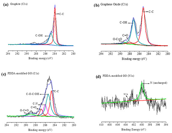 XPS spectra (C-1s) of (a) graphite, (b) graphene oxide (GO), (c) GO-poly(diallyldimethylammonium chloride) (PDDA) (RGO), and (d) XPS (N-1s) of GO-PDDA (RGO).