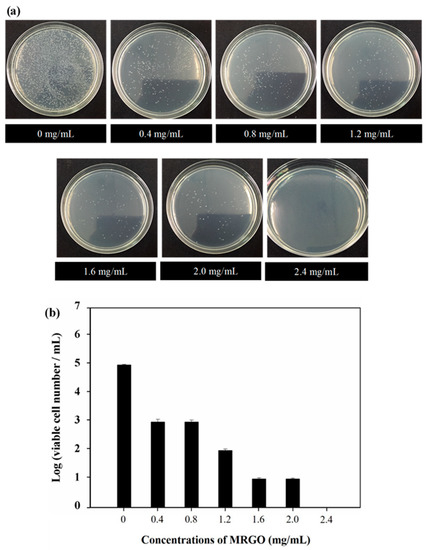 (a) Capturing activity toward the supernatant of S. aureus (105 CFU/mL) solution with various concentrations of MRGO; (b) survival S. aureus numbers with various concentrations of MRGO.