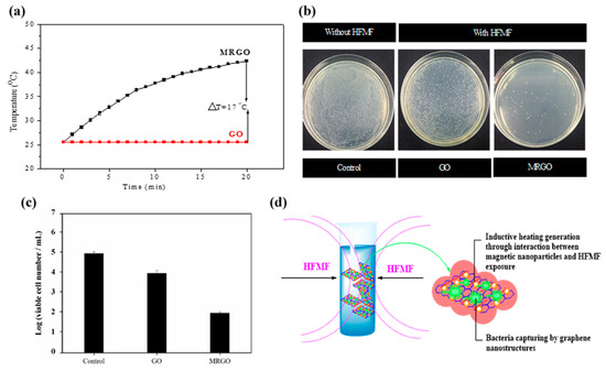 Finally, HFMF was conducted to investigate the magnetic inductive heating of MRGO and to evaluate its capability for killing bacteria. Inductive heating is thermal energy induced from the hysteresis loss of ferrites and is dependent on the type of re-magnetization process in the HFMF [31]. Figure 7a shows the results of the inductive heating ability of GO and MRGO. GO cannot heat up during the exposure to HFMF and the temperature remained around 25 °C (room temperature). Meanwhile, MRGO could increase in temperature up to ~42 °C, after the exposure to HFMF for 20 min. After HFMF was applied in MRGO, it could significantly decrease the colony number of bacteria, in comparison to that in GO (Figure 7b). The bacteria decrease from 105 CFU/mL (control) to ~102 CFU/mL (MRGO) after exposure to HFMF for 20 min, and only 0.1% of bacteria can survive. The calculated capability of MRGO to kill bacteria under HFMF is about 99.9% (Figure 7c). These results confirmed that the temperature increase in the MRGO was closely related to the incorporation of magnetic nanoparticles in the MRGO (Figure 7d). The generation of localized heat could disrupt the surrounding microbes [43].