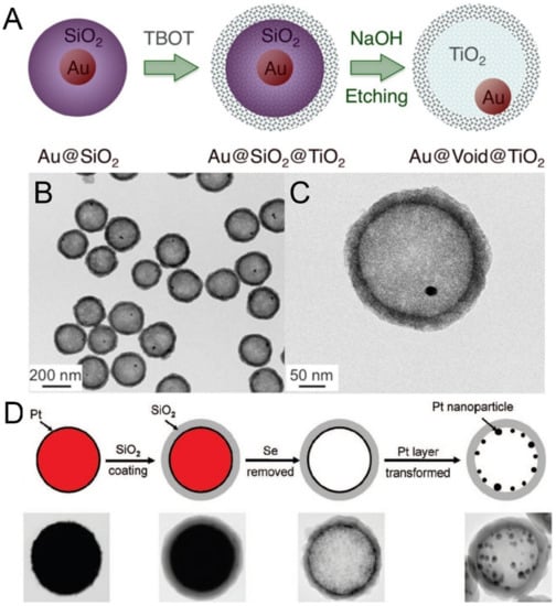 Templating approaches for yolk–shell nanostructures. (A) Synthetic scheme of Au@TiO2 yolk–shell nanostructure by using SiO2 as a sacrificial layer. (B,C) TEM images of the Au@TiO2 yolk–shell after etching the SiO2 layer. Reproduced with permission from []. Copyright Elsevier Ltd, 2016. (D) Decoration of interior surfaces in the SiO2 hollow shell by exploiting amorphous Se colloids as a template. Reproduced with permission from []. Copyright American Chemical Society, 2008.