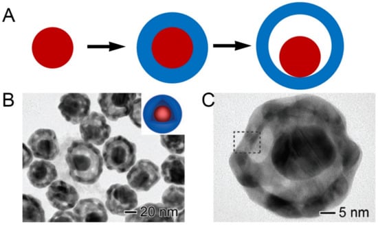 Self-templating syntheses for yolk–shell nanostructures. (A) Scheme illustrating the procedure for the Au core and Au/Ag alloy shell through the galvanic replacement reaction. (B,C) TEM images of Au@Au/Ag yolk–shell nanostructure. Reproduced with permission from []. Copyright Wiley-VCH, 2016.