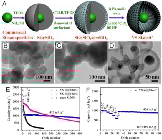 Open-ended mesoporous carbon shell was devised to facilitate the fast diffusion of Li+ ions and provide the full immersion of Si core materials in the electrolyte for higher rate capability []. Si@mC (mesoporous carbon) yolk–shell nanostructures are developed by Zhang and co-workers by using mesoporous SiO2 as a template, which is etched away later, to form mesoporous carbon shell containing Si nanoparticle in the core (Figure 5). For a comparative study, they prepared two types of Si@mC according to the void space inside the carbon shell (10 and 50 nm). The electrochemical cycling properties of Si@mC yolk–shell electrodes outperform the pure Si nanoparticle electrode (Figure 5E). Another notable observation is that enough space inside the carbon shell is important in terms of cycling performance and rate capacity retention. Small void is hard to afford the large volume expansion of Si, which can result in structural collapse of the carbon shell. Thus, the successful design of yolk–shell nanostructure takes into consideration the efficient volume expansion of Si core material. Other than the chemical etching method, spray pyrolysis is another approach to form yolk–shell Si nanostructures, i.e., Si@C, Si@NiO [,].
