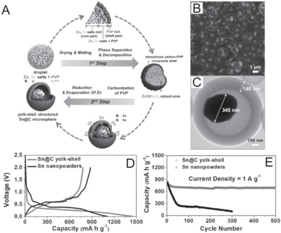 As an alloy-type anode alternative, tin is also a promising material due to its high specific capacity and low operating potential. Although tin cannot beat silicon in terms of gravimetric capacity (4200 vs. 991 mAh/g, based on the formation of Li4.4Sn, Sn + 4.4Li+ +4.4e− ↔ Li4.4Sn), it has a comparable volumetric capacity of 2020 mAh/cm3 (2400 mAh/cm3 for Si) and better electrical resistivity than graphite []. Nevertheless, tin is prone to capacity deterioration during charging/discharging, like other alloy-type anode materials, due to huge volume change (~300%) leading to electrode pulverization, delamination from the current collector, and SEI formation. Designing pure tin anode as nanostructure has been suggested to alleviate the stress of tin from volume expansion []. Intrinsic volume change during lithiation/delithiation pushes the research towards using the buffer layer to keep tin nano-/micro-scale anode from pulverization by creating core-protected structure. Kang and co-workers have demonstrated that yolk–shell nanostructured Sn@C electrode showed better cycling stability than pure Sn powder []. Carbon-coated Sn microsphere was prepared by spray pyrolysis (Figure 6). Firstly, SnO2–ZnO@C microsphere (core–shell) was synthesized and, then, transformed to yolk–shell Sn@C microsphere by reducing SnO2 and vaporizing Zn (low vaporizing temp. of Zn, ~900 °C). H2/Ar mixture gas reduced SnO2 and ZnO and the undecomposed PVP created a carbonized shell at 1000 °C. Figure 6C shows the reduced Sn yolk covered with carbon shell. The yolk–shell Sn@C electrode showed initial discharge and charge capacities of 1458 and 781 mAh/g indicating an initial Coulombic efficiency of 54%. In comparison, the pure tin nanopowder electrode has 75% of initial Coulombic efficiency due to a large irreversible capacity from an amorphous carbon shell in yolk–shell electrode. However, the yolk–shell Sn@C electrode showed a better long-term cycling performance in Figure 6E. The capacity retention of Sn@C electrode is 83% from the second cycle to 500th cycle. The stable cycling is attributed to the void in yolk–shell nanostructure, in which Sn can maintain its morphology inside the carbon shell during lithiation/delithiation. The concept of Sn@C yolk–shell nanostructure was also demonstrated in the form of nanotube [], integration with nanofiber [,], and core-sheath nanowire [].
