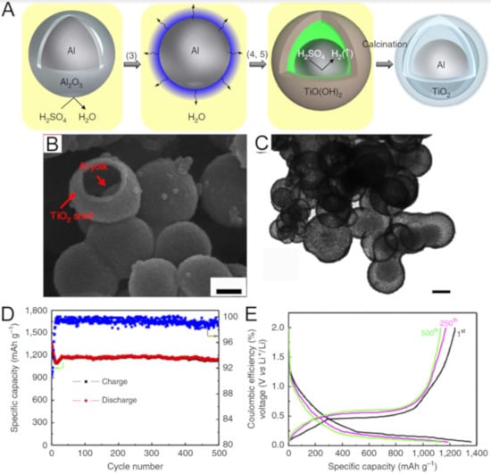 Aluminum is another attractive alloy-type anode material owing to cheap price ($2000/ton), high theoretical capacity (2235 mAh/g, based on 4Al + 9Li+ + 9e− ↔ Li9Al4), and high electrical conductivity []. However, the practical performance is still suffering from relatively low capacity due to the electrode damage from the volume change (~100%) and pulverization. Even the hybrid structure of aluminum nanoparticles with carbon achieved only ~900 mAh/g []. Instead of carbon shell, inorganic and mesoporous TiO2 shell was employed as a constituent of yolk–shell Al@TiO2 anode material by Li and co-workers []. The yolk–shell Al@TiO2 nanospheres were synthesized through forming TiO(OH) and etching Al2O3 on the surface of aluminum particles to create a void inside the shell. TiO(OH) shell is converted to anatase TiO2 by calcination at 450 °C (Figure 8A). The resultant yolk–shell Al@TiO2 nanospheres have an aluminum core (~30 nm) and TiO2 shell (~3 nm) with a controllable void space (Figure 8B,C). The Al@TiO2 yolk–shell nanosphere electrode has a long lifecycle, which maintains ~1100 mAh/g after 500 cycles at 1 C rate with 93% of Coulombic efficiency (Figure 8D,E). Even at 10 C rate, the electrode achieved a capacity of 661 mAh/g after 500 cycles. The high rate performance is attributed to the good electrical conductivity of aluminum. Compared to silicon-carbon yolk–shell electrodes, Al@TiO2 has lower capacity at a low rate (1 C), but exhibits higher rate performance after a long cycle. The Al@TiO2 has a few times larger specific capacity than LTO and graphite.