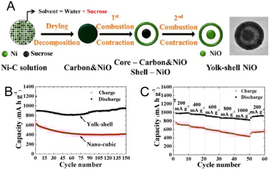 Spray pyrolysis is a continuous and rapid one-pot process for fabricating micro-/nanopowder. In addition, neither template material nor etching step is necessary compared to the templating method. Various transition metal oxides can be synthesized by spray pyrolysis with high crystallinity for a few seconds. The morphologies of the yolk–shell particles prepared by spray pyrolysis were affected by the types of spray solution and temperature. The formation of carbon-metal oxide particles was formed as an intermediate product, followed by decomposition of precursors and combustion of carbon to create yolk–shell nanostructure. Thus, most yolk–shell particles synthesized by spray pyrolysis have the same composition of shells with core materials. Figure 9 shows the formation of yolk–shell NiO@NiO nanoparticle, demonstrated by Kang and co-workers []. A dense carbon/NiO intermediate particle was formed from Ni-Sucrose droplet by the decomposition of nickel nitrate and the carbonization of sucrose. Further combustion of the intermediate particle produced core–shell carbon/NiO@NiO composite and, finally, yolk–shell NiO@NiO particles after carbon combustion. For a comparative study, the electrochemical measurements were performed with both the yolk–shell NiO@NiO and single-crystalline cubic NiO particles. Figure 9B shows the cycling performances of the two electrodes at 1 C. Whereas the cubic NiO electrode showed no increase in discharge capacities after 150 cycles, the yolk–shell electrode experienced capacity increase after 60 cycles. This is attributed to the formation of a gel-like film of the transition metal oxides due to small grain and size []. The rate performance of the yolk–shell NiO@NiO is slightly better than the pure cubic particle (Figure 9C). The simple and self-templating spray pyrolysis have been applied to fabricate various metal oxides yolk–shell nanostructure; Co3O4 [], CoMn2O4 [], Fe2O3 [], NiMoO4 [], ZnCo2O4 [], ZnFe2O4 [], ZnO/Mn3O4 [], MoSe2 [] and mixed metal oxides []. Furthermore, chemical transformation can produce transition metal sulfide yolk–shell nanostructure by an anion exchange. The prepared yolk–shell SnO2 particles can be converted into yolk–shell SnS particles through sulfidation [].