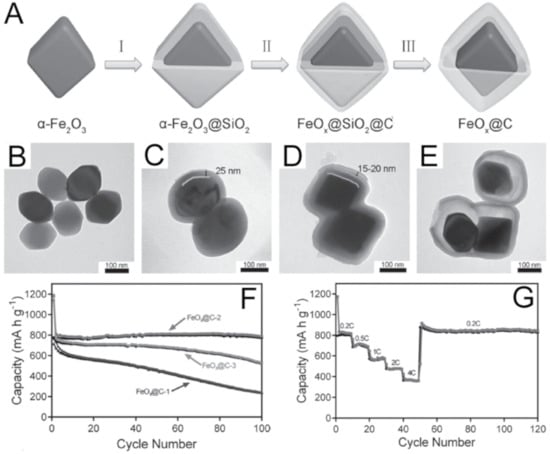 (A) Schematic illustration showing the formation of FeOx@C yolk–shell nanostructure. (B–E) TEM images corresponding to each step in (A): α-Fe2O3 → α-Fe2O3@SiO2 → FeOx@SiO2@C → FeOx@C. (F) Cycling capacity of FeOx@C yolk–shell nanostructures at 0.2 C. (G) Rate performance of FeOx@C-2. Reproduced with permission from []. Copyright Wiley-VCH, 2014.