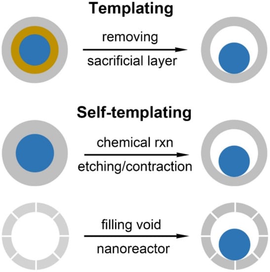 Yolk–shell nanostructures indicate a class of hybrid materials consisting of a hollow shell encircling movable cores with the void. The hollow nanostructures containing different nanoparticles inside possess unique morphological features, which bring low density, large surface area, and great loading capacity. In addition, the yolk–shell nanostructures can create hybrid materials with complex functions for specific purposes by integrating various functional components into this system. Thus, a lot of attention has been paid to this promising structure since it has great potential for diverse applications in catalysis, nanoreactors, drug delivery, and energy storage [,,,,,]. The existence of the void inside allows the exposure of the inner materials with a protective effect of the shell, which is advantageous in the preservation of the core materials. The void space in the yolk–shell nanostructures can serve as a storage space for functional cargoes and as a reaction room for chemical reactions. Compared to the conventional core–shell structures, the yolk–shell nanostructures offer additional availability for the tuning of materials. As is depicted in the Scheme 1, the yolk–shell morphologies can be achieved by straightforwardly templating methods as well as self-templating syntheses without additional templates for the formation of the cavity.