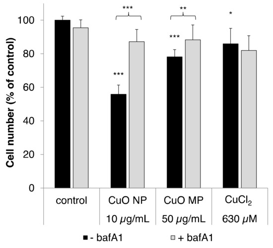 As shown in Figure 1, 10 µg/mL CuO NP exerted the most pronounced cytotoxicity, leading to a decrease of cell number to 56% compared to our control. In contrast, CuO MP and CuCl2 were far less cytotoxic, even though applied at 5-fold higher mass doses; thus, CuO MP decreased the cell number to 78% and CuCl2 to 86%. In the presence of the vacuolar H+-ATPase inhibitor bafA1, the cytotoxicity of the CuO particles was almost completely abolished, most strikingly in case of the CuO NP, but also in case of the CuO MP. Thus, the cell number was recovered to about 90% in both cases. However, no effect of bafA1 on the cytotoxicity of CuCl2 was observed, excluding unspecific interactions.