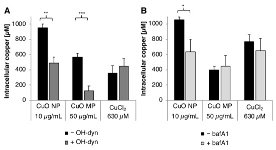 Cellular copper uptake by CuO NP, CuO MP and CuCl2 was analyzed via graphite furnace atomic absorption spectroscopy (GF-AAS). As described in Materials and Methods, we applied a special post-incubation procedure, where the plasma membrane was removed to avoid any overestimation of intracellular copper levels due to an incomplete elimination of particles from the cellular surface, and thus quantified copper levels within the soluble cell fraction. Within our previous study, CuO NP were found to result in a pronounced dose-dependent intracellular copper overload up to millimolar concentrations, while CuCl2 showed the lowest and almost constant copper levels up to 400 µM independent from the applied dose. CuO MP resulted in intermediate but also concentration-dependently increased copper levels [8]. Within the present study, the intracellular copper content was investigated after 8 h incubation in the absence or presence of the dynamin-dependent endocytosis inhibitor OH-dyn (Figure 2A), as well as after 24 h in the absence or presence of bafA1 (Figure 2B). The shorter co-incubation time in case of OH-dyn was chosen due to its high cytotoxicity after 24 h treatment, as described above.