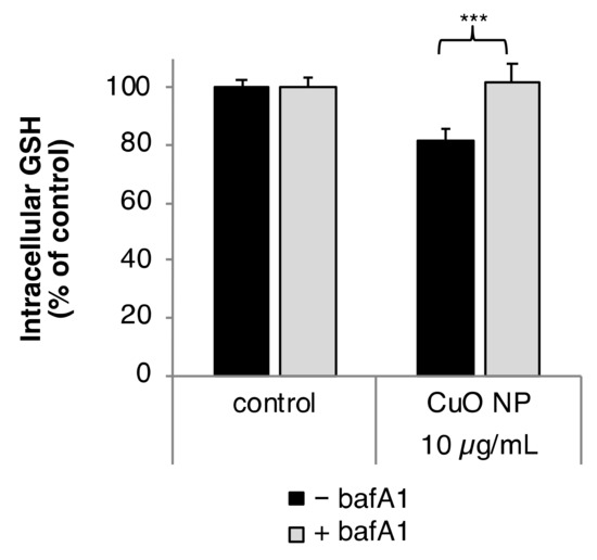 Modulation of intracellular GSH level by CuO NP depending on bafA1 was analyzed according to the method established by Tietze [24]. Intracellular GSH content was diminished to 80% of control after 2 h treatment with 10 µg/mL CuO. Co-treatment with bafA1 prevented the CuO NP-induced reduction of intracellular GSH completely (Figure 3).