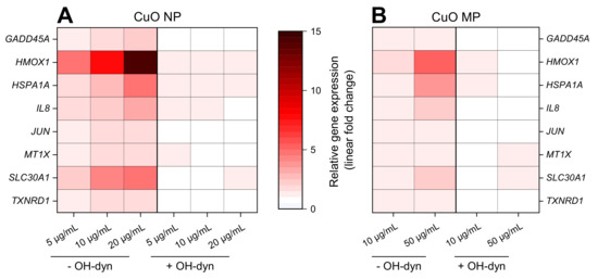 8 h treatment with OH-dyn itself did already modulate the expression of some of the discussed genes, namely HMOX1, HSPA1A and IL8, albeit to a far lesser extent as compared to CuO NP exposure (Figure S1). Therefore, the effects of the co-treatments were related to the OH-dyn treated control. The impact of 8 h OH-dyn co-treatment on copper particle-modulated gene expression is summarized in a heat map view, displaying the relative gene expression related to the respective control (Figure 4). Strongest effects, starting at the lowest applied concentration of 5 µg/mL, were observed in case of CuO NP (Figure 4A). Most pronounced inductions were observed in case of the ROS-inducible HMOX1 and HSPA1A genes. Furthermore, mRNA levels of the copper uptake-related genes MT1X and SLC30A1 coding for metallothionein 1 and the zinc transporter ZnT-1, respectively, were induced by CuO NP. Also, transcription of the DNA damage inducible gene GADD45A, the pro-inflammatory gene IL8, the proto-oncogene JUN and the anti-oxidative defense-associated gene TXNRD1 were enhanced in a strictly dose–dependent manner. In contrast, the modulation of expression occurred to a much lesser extent by CuO MP, with relevant, dose-dependent effects restricted to HMOX1, HSPA1A, IL8 and SLC30A1 transcript levels, even though up to 5 times higher copper amounts were applied (Figure 4B). Most strikingly, no alterations of gene expression compared to controls were observed after co-treatment with OH-dyn, neither in the case of CuO NP nor CuO MP.