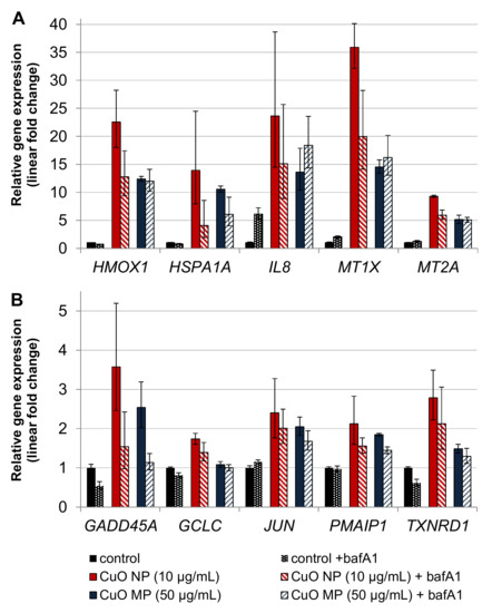 Gene expression profiling applying 10 µg/mL CuO NP or 50 µg/mL CuO MP in the absence or presence of 24 h bafA1 co-treatment is shown in Figure 5A,B. Again, the most pronounced elevations of gene expression were observed in case of CuO NP when compared to CuO MP, even though the latter were applied at 5-fold higher amounts. BafA1 led to a strong, about 50% reduction of the CuO NP-mediated induction of the oxidative stress, as well as the copper uptake/homeostasis-related genes HMOX1, HSPA1A, MT1X and MT2A, as well as the DNA damage response gene GADD45A. In case of the pro-inflammatory IL8 gene, results have to be interpreted with caution, due to the high standard deviations and the fact that a 6-fold transcriptional induction was already evident in case of bafA1 alone. Further inductions were observed in case of JUN, the pro-apoptotic PMAIP1, as well as the anti-oxidative associated genes GCLC and TXNRD1; in these cases, baf1A did not substantially alter the respective expression levels. In contrast to CuO NP, except for HSPA1A and GADD45A, bafA1 did not affect CuO MP-induced transcriptional changes.